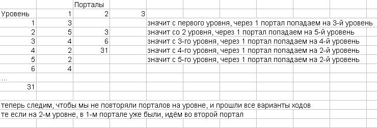 делаем 4 колонки в первой нумеруем от 1 до 31 (1 вход, 31 выход) если мы находимся на 2 уровне, есть 3 двери, идём в первую в рядке 2, колонка 2 ставим место куда попали и по аналогии проходим все варианты... больше 1 часа не займёт, даже при жутких лагах пример Вложение 7920 |