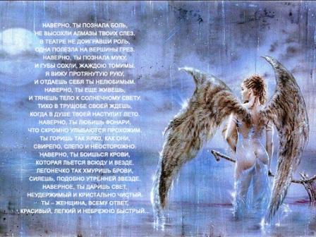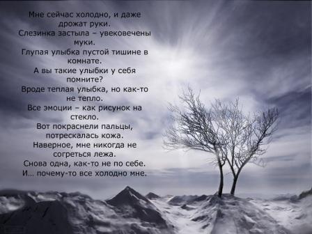 Наверно, ты познала боль, Не высохли алмазы твоих слез. В театре не доигравши роль, Одна полезла на вершины грез. Наверно, ты познала муку, И губы сохли, жаждою томимы. Я вижу протянутую руку, И отдаешь себя ты нелюбимым. Наверно, ты еще живешь, И тянешь тело к солнечному свету. Тихо в трущобе своей ждешь, Когда в душе твоей наступит лето. Наверно, ты любишь фонари, Что скромно улыбаются прохожим. Ты горишь так ярко, как они, Свирепо, слепо и неосторожно. Наверно, ты боишься крови, Которая льется всюду и везде. Легонечко так хмуришь брови, Сияешь, подобно утренней звезде. Наверное, ты даришь свет, Неудержимый и кристально чистый. Ты – Женщина, всему ответ, Красивый, легкий и небрежно быстрый. вот так =( Самовольно опустились руки. Я совсем чуть-чуть устала. Громкие, непонятные звуки, Легла спать. Раздеваться не стала. Веки забетонировали, наверно забыли, Что я – человек, и мне нужно смотреть. А может, это совсем не они и были, Не они держали крылья, мешая лететь. Может, сама натаскалась камней, Сама нагрузила себя до предела. Не заметила истертых в кровь ступней, Устала, так и не начав своего дела. Зарытая по горло, и никак не вылезти, Лицо все горит, и никто не поможет - Не может. Как же все вынести, Не потеряв сердце, которое гложет… |
