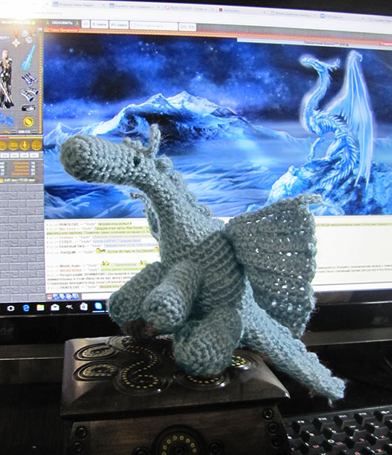 Посмотрела библиотеку... Есть у нас Плюшевый Кнопах, Плюшевый Урхатонг, даже Резиновый Лич. А Дракона нету. Вот и решила связать Сумеречного Дракона, милого и симпатичного. Для сравнения фото с прототипом.