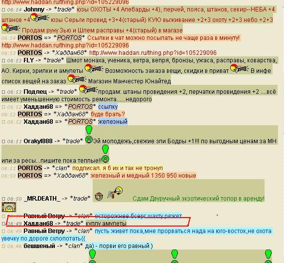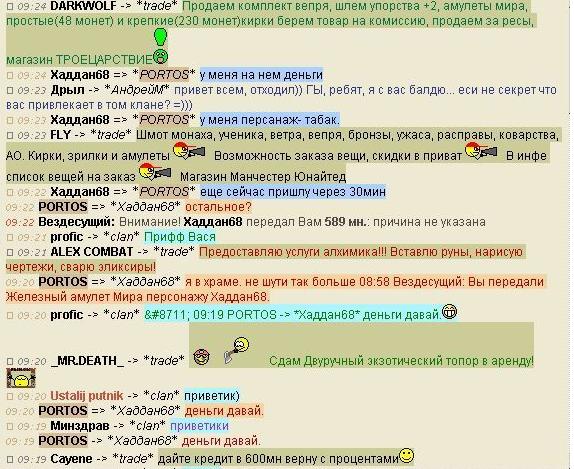 22:30 Хаддан68 Передача VladS От Хаддан68[6] к VladS[7] . Передача "Железного амулета Мира" (1 шт) (S/N:80474103). Причина: з На моё требование о расторжении сделки и возврате денег ответа не получил, персонаж ушёл в Астрал. Есть чёткая уверенность в том, что я не первый пострадавший, так как, со слов самого Хаддан68, за 15 мин до того он продал ещё 1 Железный амулет Мира другому персонажу. |