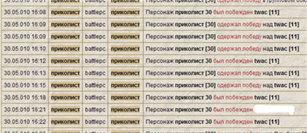 из скрина видно что 30.05.10 было проведено 9 боёв в которых не было заведомова победителя. Общий счёт боёв составил 5:4 в мою пользу из чего следует что победы были рандомными. PS. закрашеный ник вы и так насколько я знаю можете посмотреть! |