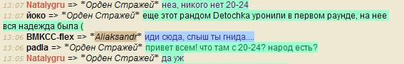 01:14 Вездесущий: Внимание! Темный Ассасин [18] подверг персонажа BMKCC-flex заклинанию Молчание (6 часов). Причина: оскорбление ст.14 НО, рецидив.