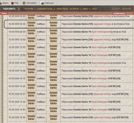 Мы просто забыли про один бой, который состоялся в 00:36 http://forum.haddan.ru/attachment.php?attachmentid=12574&stc=1&d=12436391 13 Этот бой был с питомцами, остальные 10 кулачных поединков состоялись через 13 часов... Поэтому была очень слабая надежда на то, что состав участников группового боя и остальных 10-ти боёв неодинаков... а срок наказания уже почти наполовину прошёл ![]() |