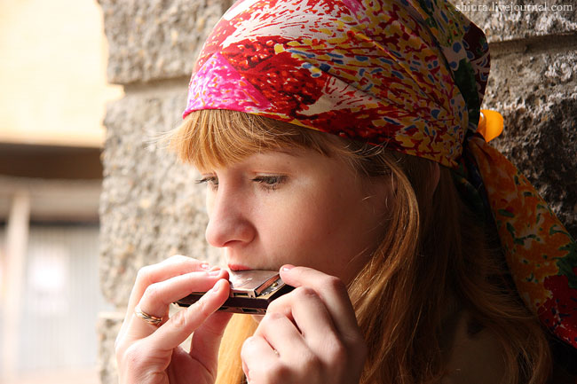 девушку, играющую на губной гармошке с длинными волосами