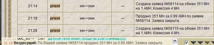 1-я 21:19 Вездесущий: По Вашей заявке №58114 продано 351 МН за 0.99 АМН. Заявка закрыта. |