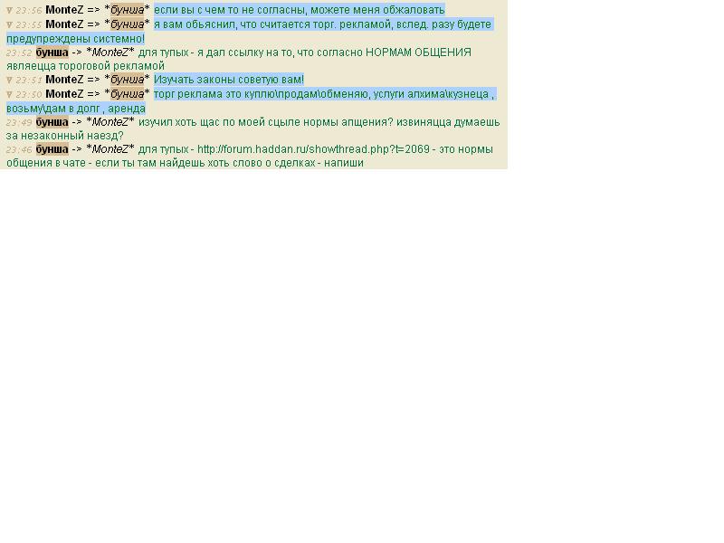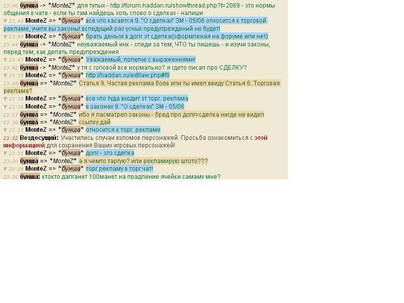 вроде инк MonteZ - довольно древний, но я не ожидал, что он ТАК спалится в незнании законов Хада он наехал на меня за то, что я написал в ЧАТЕ, а закон приплел какойто левый http://haddan.ru/ext/law.php#f8 я дал ему ссылку на НОРМЫ ОБЩЕНИЯ http://forum.haddan.ru/showthread.php?t=2069 - где четко сказано, ЧТО можно а ЧТО нельзя писать в общем чате Статья 6. Торговая реклама 1. Торговая реклама разрешена только в торговом канале чата. 2. В торговом канале чата разрешена только торговая реклама. 3. Реклама товаров и услуг вне торгового канала наказывается предупреждением. 4. Рецидив рекламы товаров и услуг вне торгово канала наказывается молчанием сроком от 10 минут до 12 часов. вероятно мой вопрос о том, кто даст в долг, он принял за РЕКЛАМУ??? явно не товара, значит я рекламировал УСЛУГУ??? даже судя по его ссылке на 9. "О сделках" ЗМ - 05/06 - Статья 4. Кредитование. Кредитование разрешено всем персонажам старше четвертого уровня. Кредит должен быть надлежащим образом оформлен на форуме игры. Процентная ставка по кредиту не должна превышать 5%. Процентная ставка начисляется от первоначальной суммы займа. Максимальная сумма кредита не может превышать семидесяти монет на уровень получателя кредита. Минимальный срок кредита – 3 дня. Максимальный срок кредита не может превышать трех суток на уровень получателя кредита. Максимальное количество кредитов – 3. У персонажа может быть только 1 незакрытая сделка по кредитованию с другим персонажем. я не собирался брать в долг на Минимальный срок кредита – 3 дня. и уж тем более я не собирался ничего оформлять на форуме - а значит к кредитованию моя фраза не имела НИКАКОГО отношения после всего вышеизложенного прошу вломить по черепу инку MonteZ, послать его в инковские ясельки, где ему ПОДРОБНО изложат все законы Хаддана, а в особенности или хотя бы - НОРМЫ ОБЩЕНИЯ на территории Хаддана а потом, если вам делать нефиг - перепишите НОРМЫ ОБЩЕНИЯ - типа просьба о паре сотне манет на минут 10-20 в долг - это типа тороговая реклама)